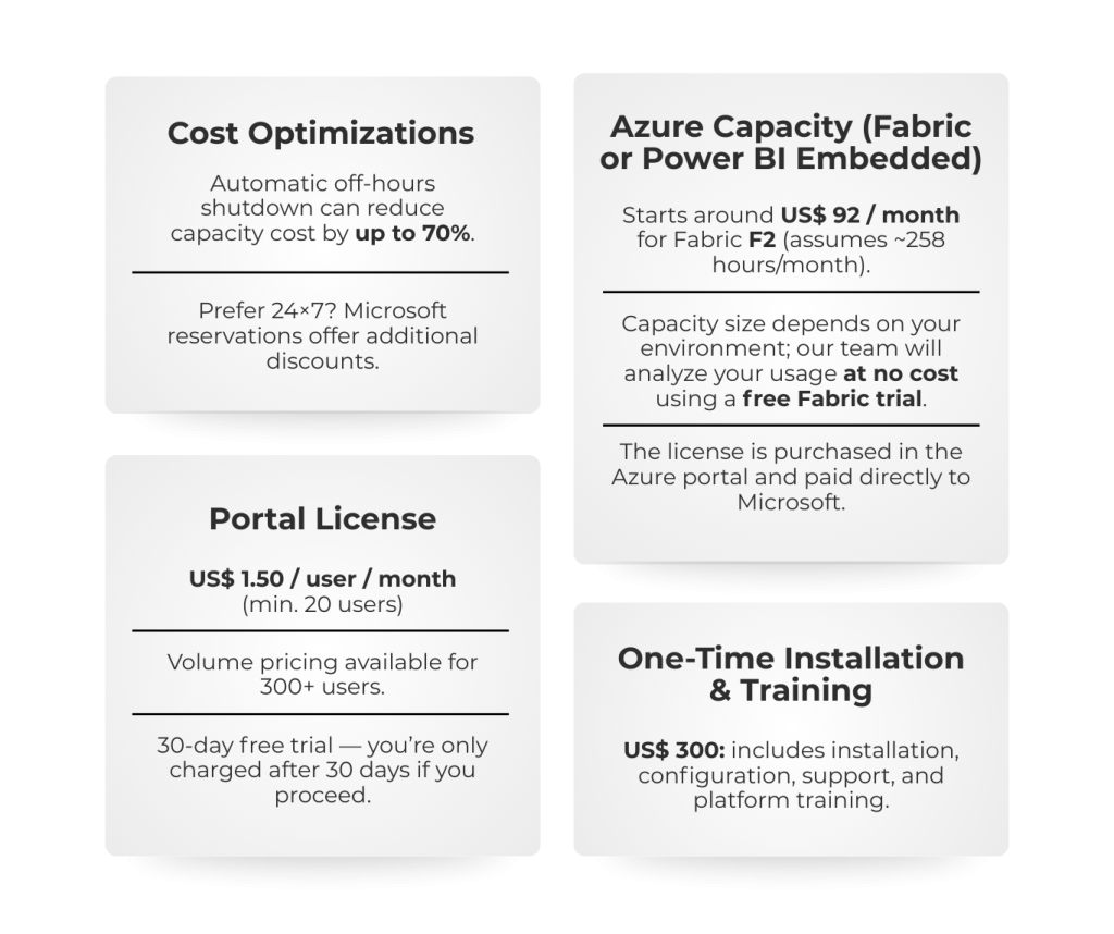 Power Embedded is a fully branded, SaaS portal that uses Microsoft Fabric or Power BI Embedded capacity to publish and govern your reports, cutting license costs by up to 90–95%, democratizing access, and keeping full control over users, groups, permissions, folders, RLS, colors, and logos.